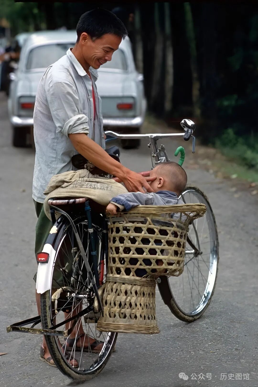 1981年,四川乐山。一名年轻的父亲骑着自行进城,车后座上竹篓里,坐着他的小儿子。