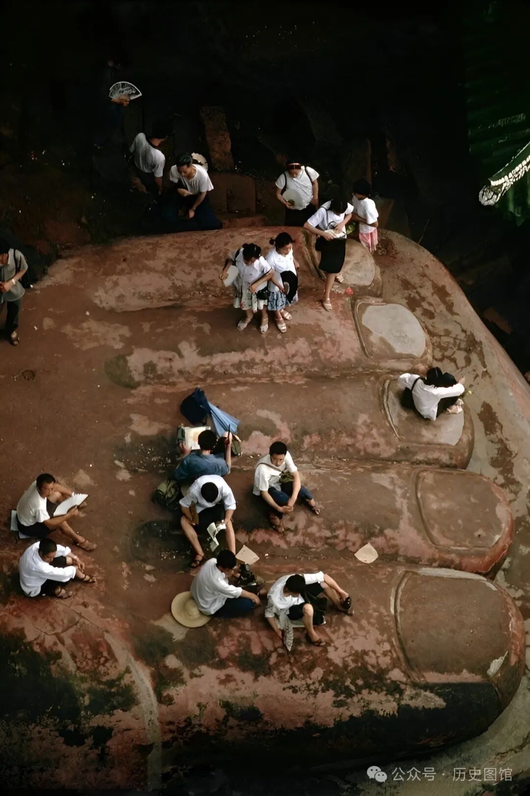 1981年,四川乐山大佛。看上去跟现在的大佛不太一样,从上到下长满了绿色的苔藓。