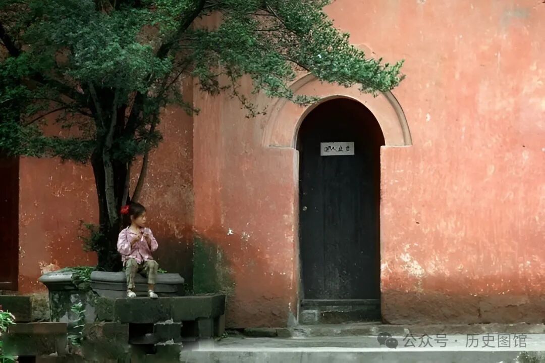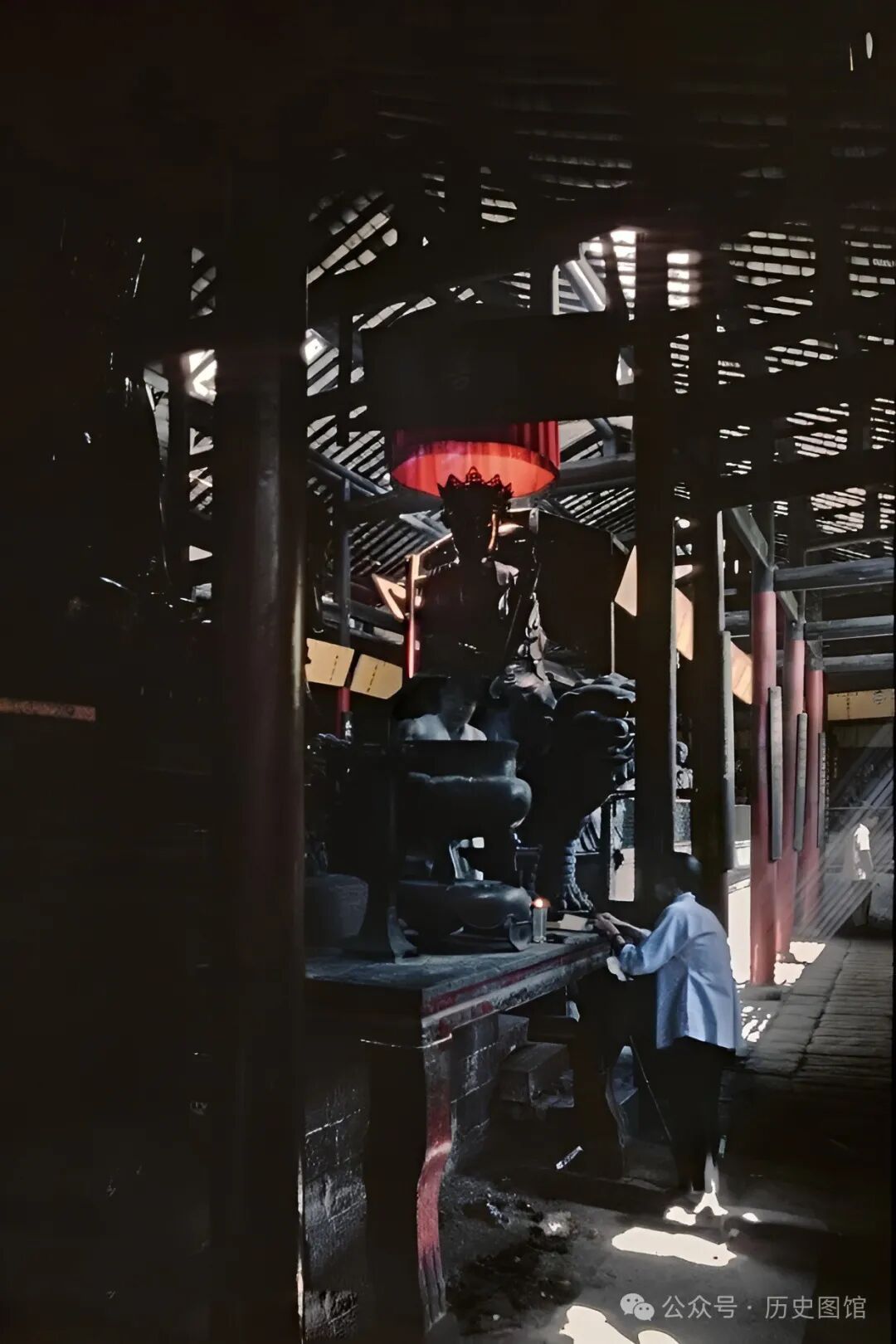 1981年,一名老太太拄着拐杖,来到四川乐山一处寺庙里,站在供桌前上香。台上供奉的神像是菩萨。从这个角度看,寺庙规模不小。