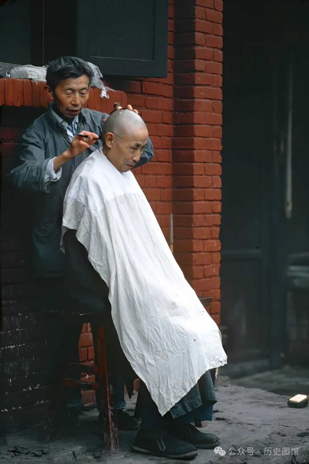 80年代,乐山街头。一名流动理发师,正在为顾客理发,手艺非常娴熟。坐在凳子上的顾客,脸上露出了满意的微笑。