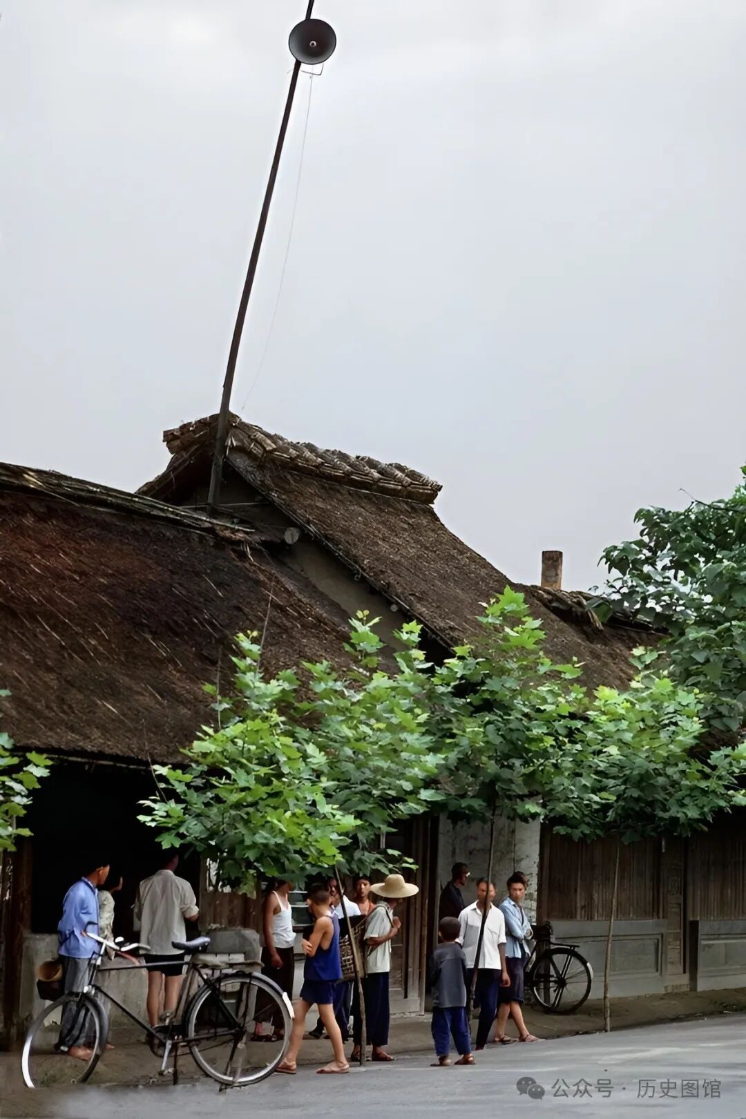 1981年,四川乐山街头景象。建筑是草房屋顶,看上去古色古香。行道树种植的是法国梧桐,长得郁郁葱葱。街边一家店铺门口,围着着不少人。
