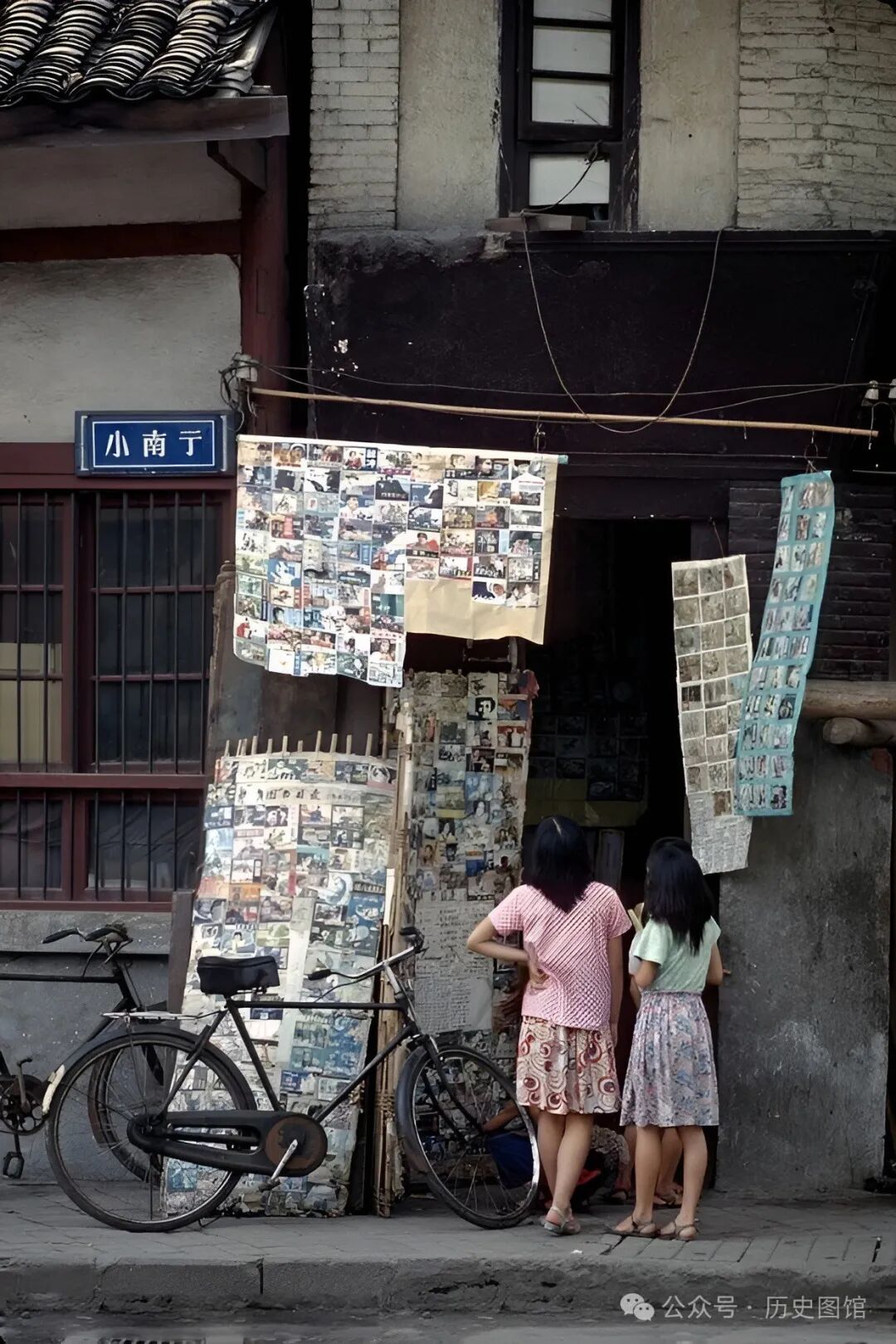 80年代的小孩子,最喜欢看的就是小人书。照片中,两个小女孩站在一家书店门口,仔细观看店门口张贴的小人书广告。书店门口停着的是大链盒自行车。