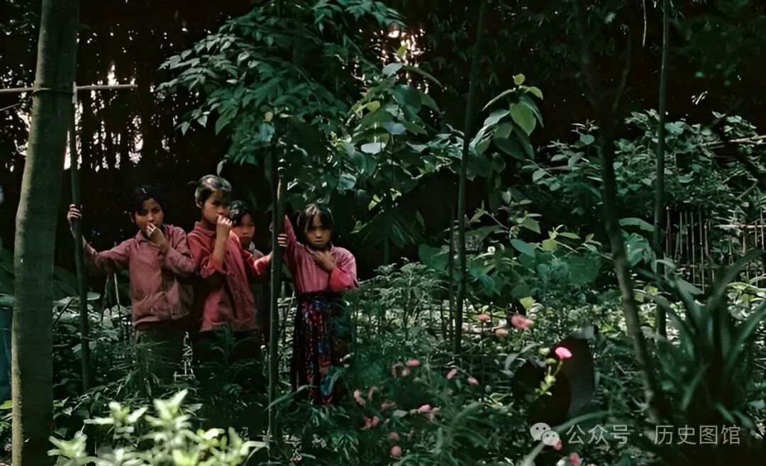 这张照片,拍摄于峨眉山。当时,四个小女孩正在花园里玩耍,摄影师拍下了这一瞬间。小女孩们第一次见到外国人,还举着相机对着她们拍照,都觉得很好奇。