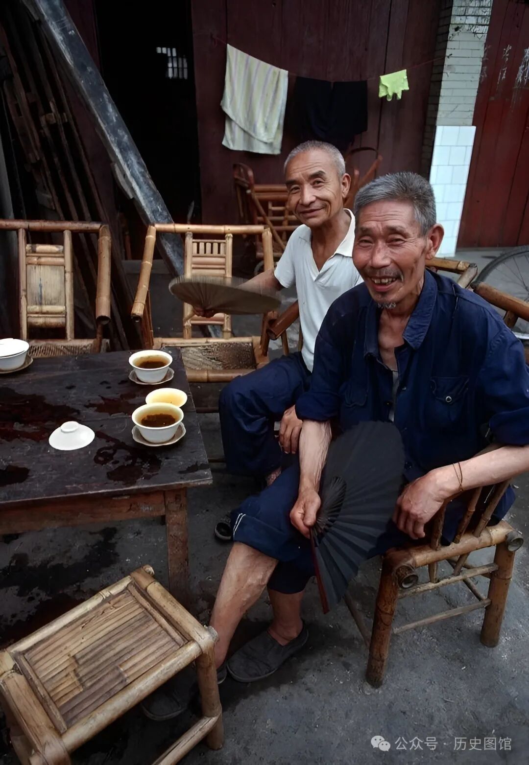 80年代的乐山街头,像这样的小茶摊随处可见,是当地人休闲纳凉的好去处。照片中,两位大爷坐在竹椅上摇着扇子,品着一碗茶,别提多惬意了。