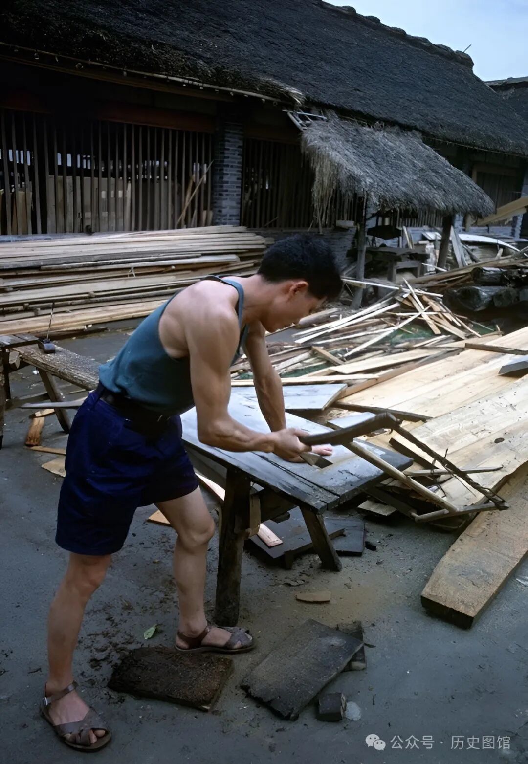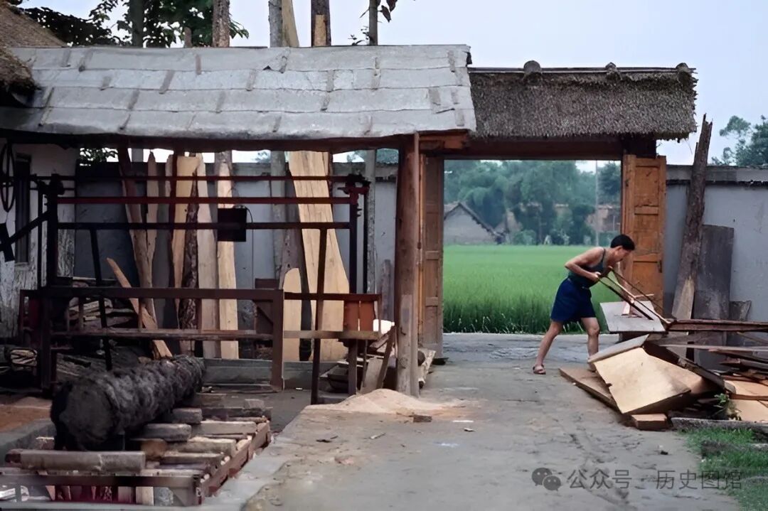 摄影师走近这名木匠,他正在娴熟地锯开一块木板。院子里的地面上,堆放着很多木料。看来这个家具厂规模不小。在过去,木匠是一门很吃香的职业。