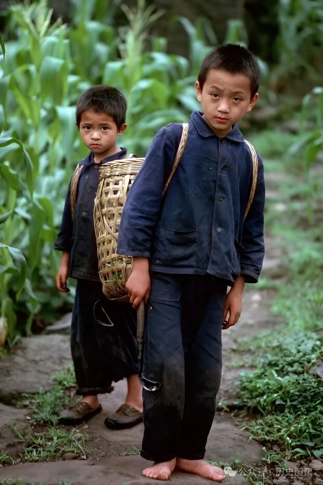 1981年,四川乐山乡下的一条小路上,两个小男孩背着竹篓,正准备去山上割草。他们衣着朴素,一人解放鞋,一人光着脚。两人手里都拿着一把镰刀。