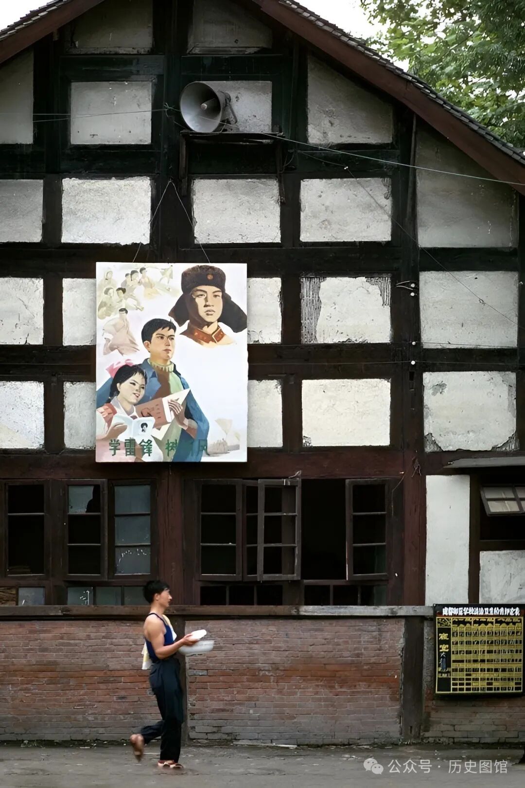 1981年,四川乐山一个学校里,一名老师端着脸盆去洗漱。旁边建筑上,悬挂着一个大喇叭,喇叭下面有一幅“学习雷锋,树新风”的宣传牌。在窗户旁边,黑底黄字的牌子,像是值日牌。画面很有年代感。