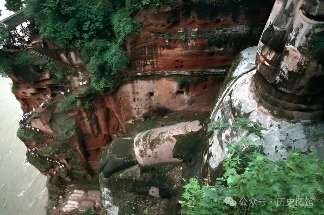佛像后面山体上的植被也很茂盛。那时候的水位好像比现在高一些。游客也没有现在人多,他们有的人还站到了佛像巨大的脚上。如今,再看看修葺一新的大佛,和过去完全不一样。