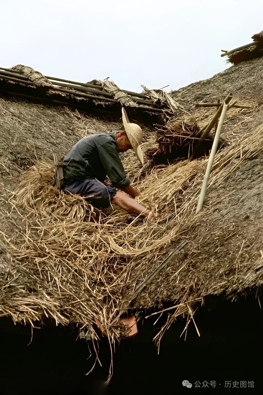 1981年,四川乐山。一名建筑工匠,正在草房顶上更换新的稻草。,看上去非常专业。