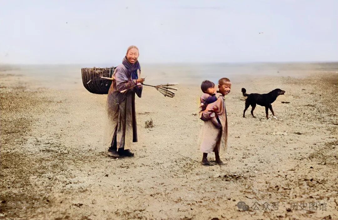 30年代,一名女子带着孩子在野外拾牛粪。她背着一个大竹筐,手拿一个竹耙子。在草原上捡拾牛干燥了的牛粪。带回家就是最好的燃料。既可以用来生火做饭,用能用来取暖。哥哥背着小妹妹,跟着妈妈拾粪,旁边还有一只小黑狗。