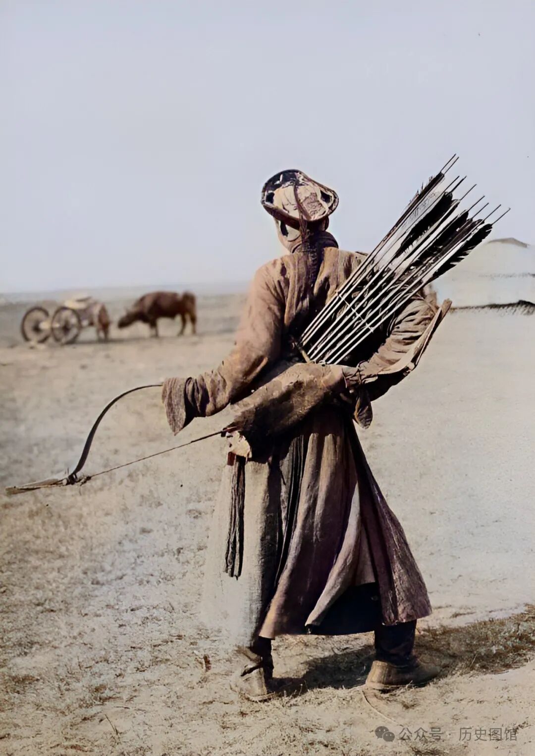 30年代,蒙东地区一名弓箭射手,正在练习射箭。他手拿弯弓,背着箭囊。一看就是射箭能手。史料记载,过去的蒙古骑兵,弓箭是最主要的远程攻击武器,射程、射速、精确度、杀伤力都很出色。
