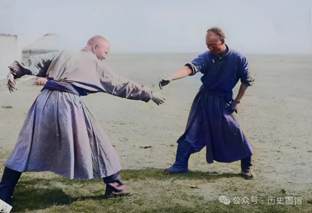 草原上,两名蒙古摔跤手正在切磋技艺。蒙古摔跤,是一项历史悠久的体育活动。史料记载,蒙古摔跤在十三世纪盛行于北方草原。既是体育活动,也是一种娱乐活动。所属在祭敖包和那达慕大会时进行。