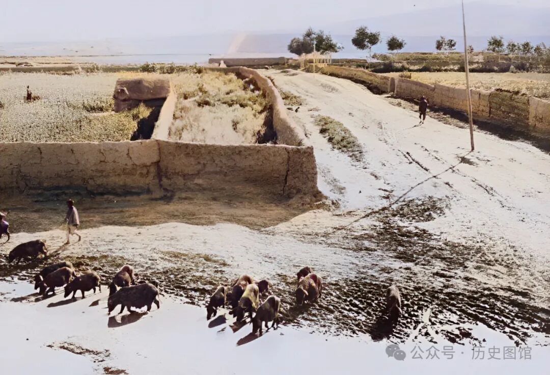 城门前有一处积水坑。一名放牧小猪的人,将小猪赶到水坑旁饮水。这张照片,是站在城门楼上拍摄的。画面很有生活气息。