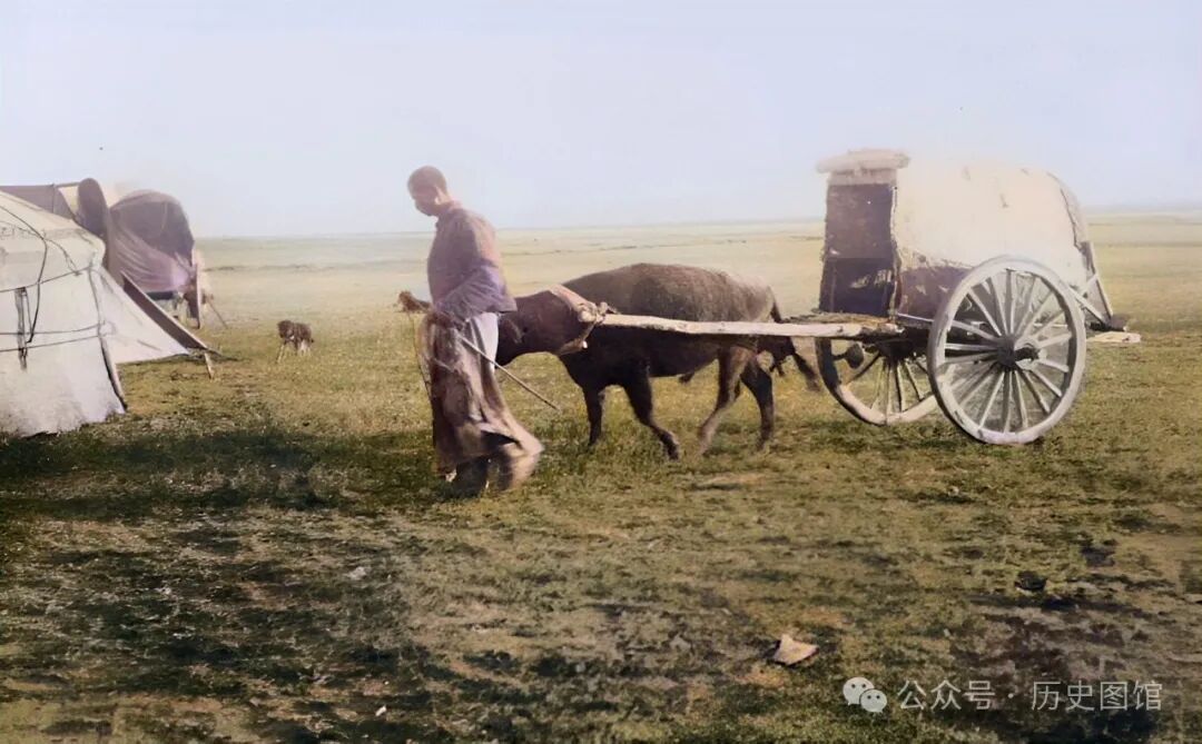 30年代,蒙东地区草原上,一名男子赶着牛车回到自己的家。这种牛车,有巨大的木制轮子,车上还装有棚子。既可以装在货物,也可以载人。在过去,牛车是草原上的主要交通和运输工具。另外,牛拉在地上的牛粪,是最好的燃料。