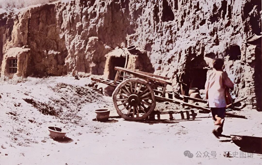 在内蒙古地区,人们不仅住在蒙古包,也有人居住在洞穴里。在土崖上挖掘出洞穴,一家人居住在里面,冬暖夏凉。照片中,几户人家的洞穴挨得很近。门前就是院子,停放着木轮大车。一名女子抱着孩子走进洞穴。