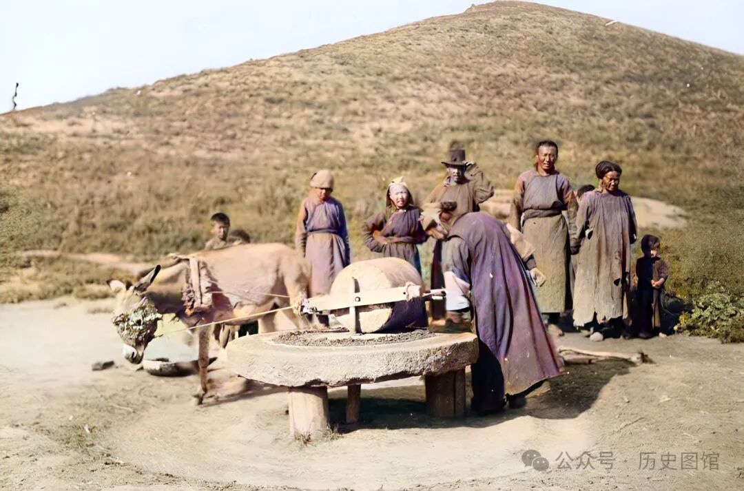 1932年,林西县郊外。一些村民正在一处空地上磨面。一头蒙着眼睛的毛驴正拉着石磙,围着碾盘转圈。在过去,这是最常见的磨面方式,可以使谷物等破碎或去皮。不过,在七八十年代的农村,还能见到。现在已经很少能见到了。