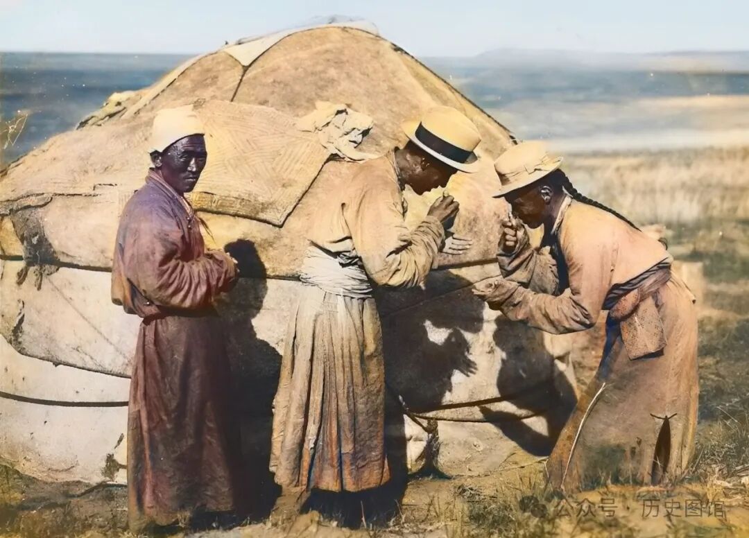 照片中,两名牧民站在自家的蒙古包前,欢迎远道而来的客人。宾客相见,各自拿出自己的鼻烟壶让对方细闻。牧民们以这种独特的方式,表达欢迎之意。不过,这种礼节现在已经很少能见到了,感觉很有意思。