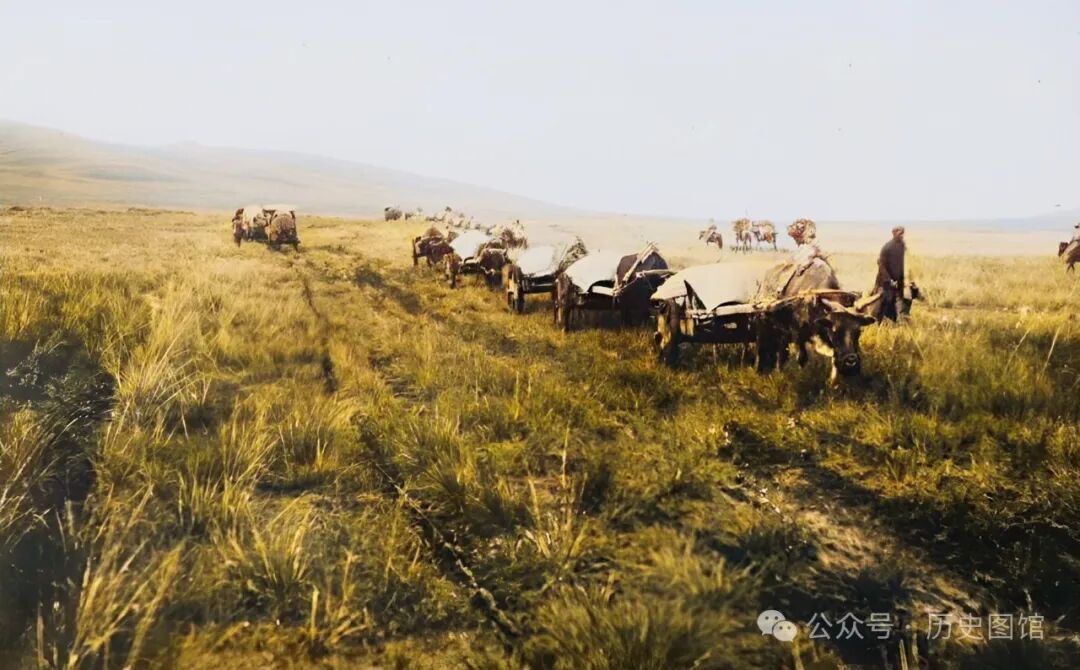 草原上,走来一支牛车队。车上装载着货物,上面覆盖着毛毡。这是一条繁忙的主干道。常年的车辆碾压,地上留下了几道深深的车辙。大草原一眼望不到边,空旷又辽阔。