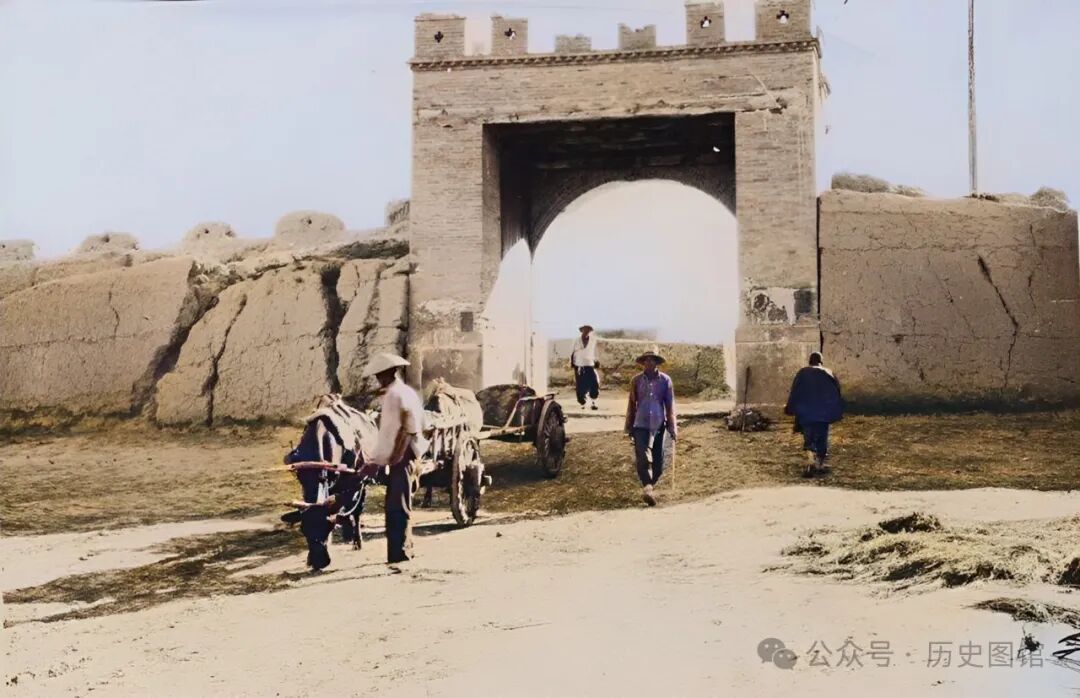 30年代,林西城外景象。城门前是一条宽阔大路,两侧是大面积的农田,都垒砌有围墙。当地人正在田地里干活。