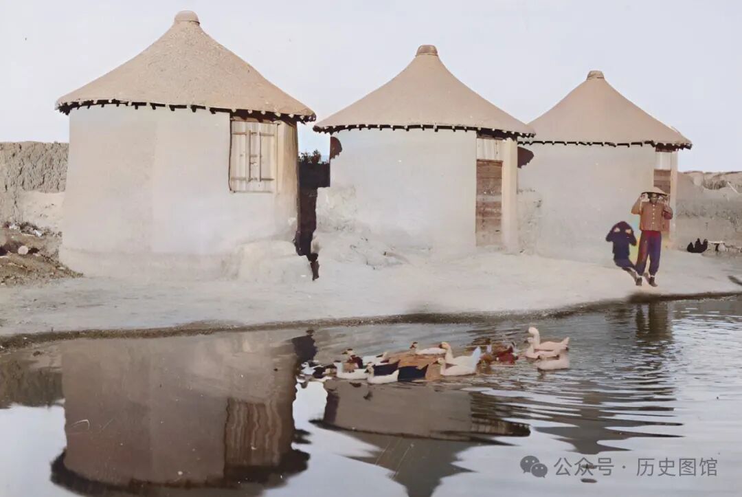 这是当地人修建的一种谷仓。圆形的墙壁,用泥土垒砌而成。开有门和通风的窗户。屋顶为圆锥形,可以很好地排放雨水。远远望去,与蒙古包很相似。照片中,一名男子正在谷仓边的小河里放鸭子。画面很有生活气息。