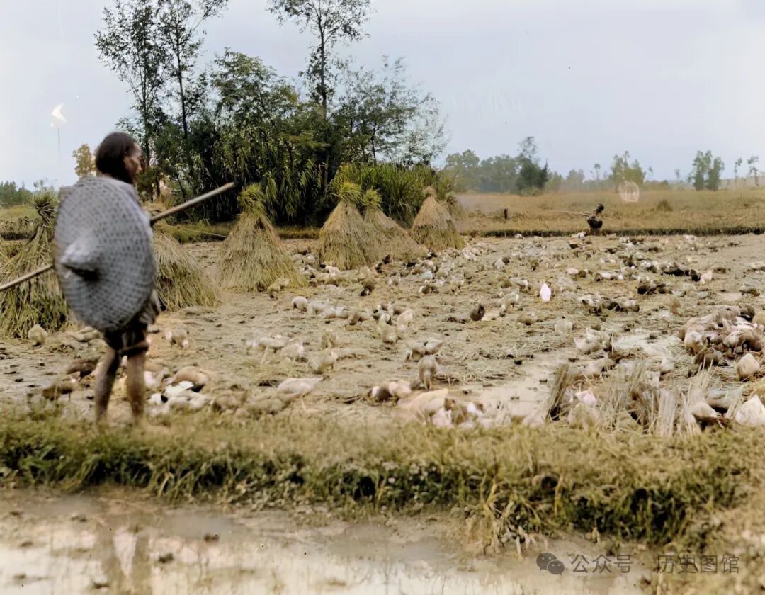 1917年,汶川苏村郊外,一名女子正在放牧鸭群。她背着一个巨大的斗笠,手里拿着一根竹竿。