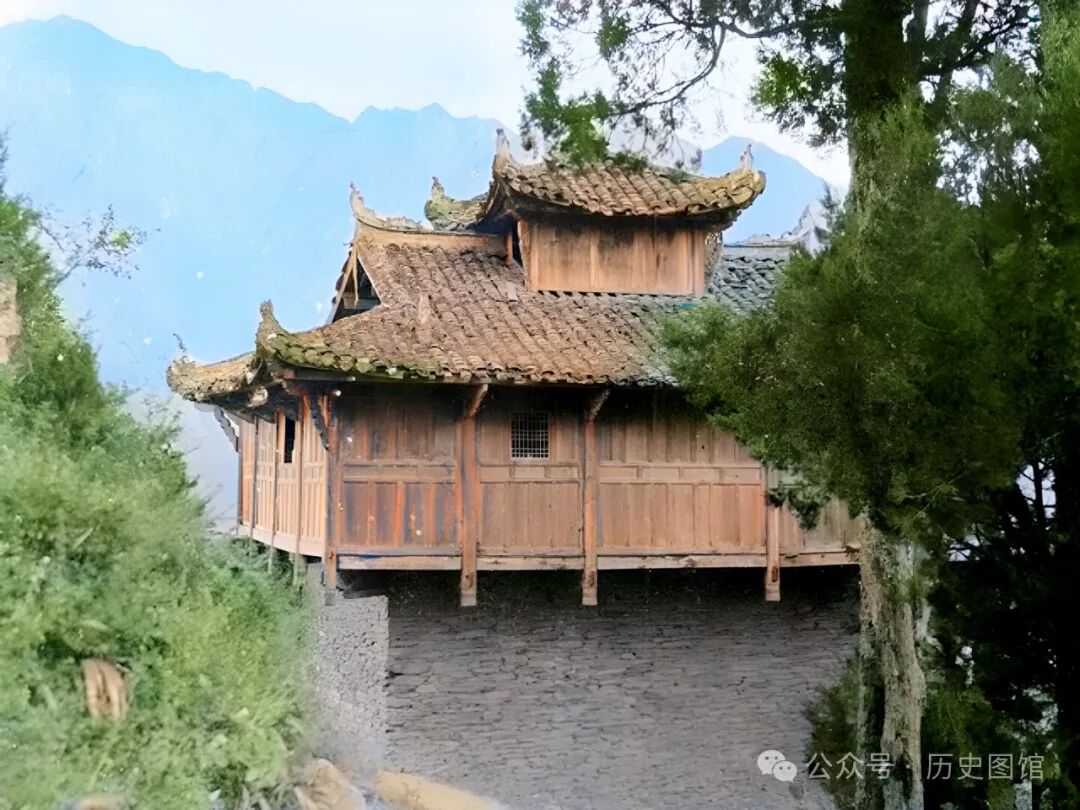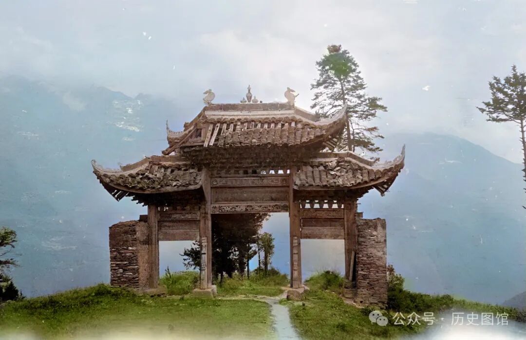 1917年,在汶川一座山头上,摄影师看到一座三间四柱三楼牌楼。由于年代久远,飞檐上的瓦脱落,露出了里面的木头椽子。背景里,青山在云雾中连绵不绝,犹如水墨画。