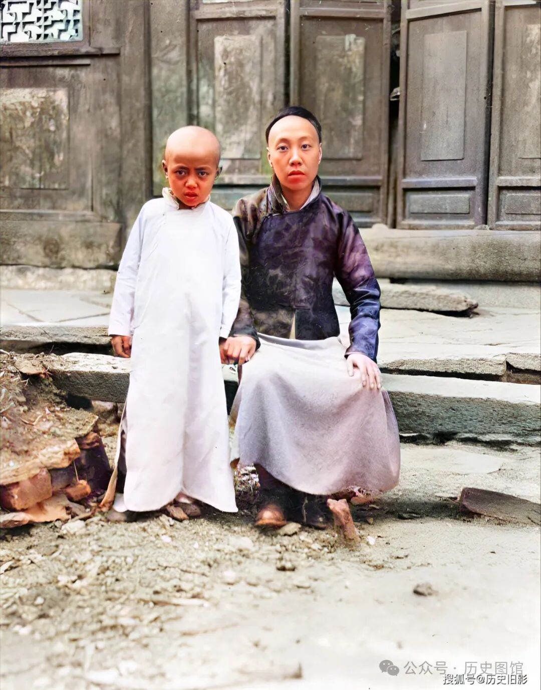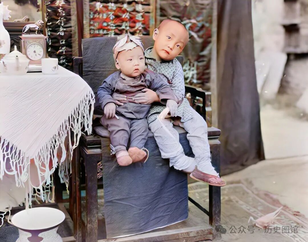 这是汶川当地一户人家,小男孩抱着弟弟坐在椅子上。房间内的陈设很讲究,桌子上铺着整洁的桌布,红木做的太师椅,后面的屏风上写满了文字。由此可以看出,这是一户比较富裕的家庭。照片里的兄弟俩都很可爱,哥哥歪着小脑袋看着镜头。