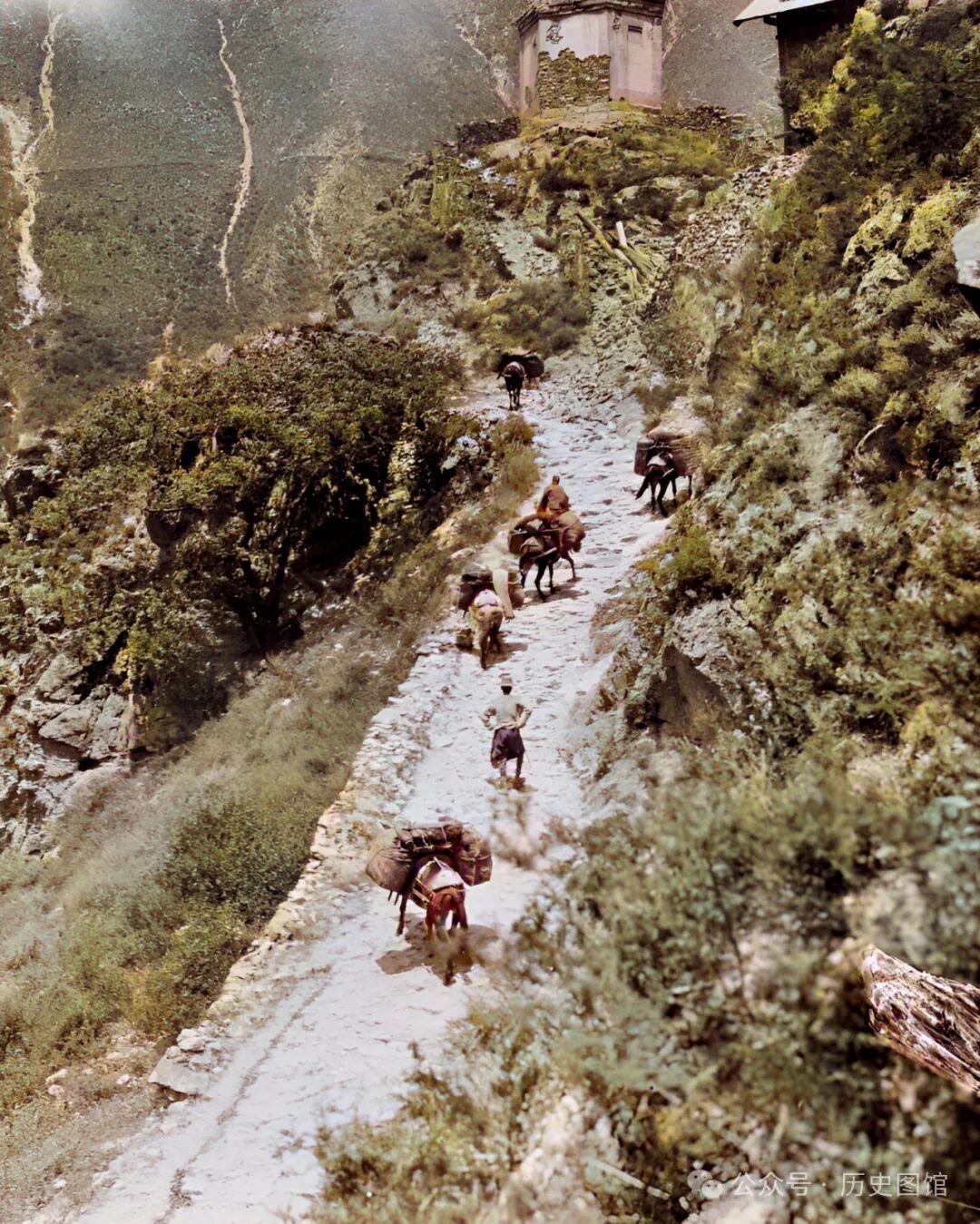 1917年,汶川境内一条山路上边上,矗立着一座寺庙。庙内烟雾缭绕,看来香火很旺。石头铺就的路面,路人的常年行走,把石头磨去了棱角。一些挑夫放下担子,站在路边休息。道路的尽头,一座大山高耸如入云。