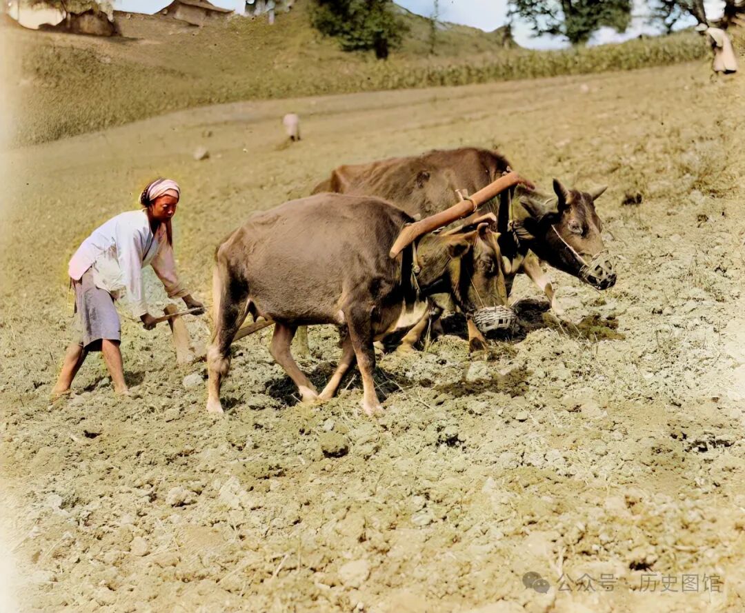 在汶川一座村寨外面,一名农民正在犁地。他使用的是传统的犁子,两头牛在前面拉。这种传统农耕方式,延续了数千年。在上世纪七八十年代的农村,还能看到这样的画面。