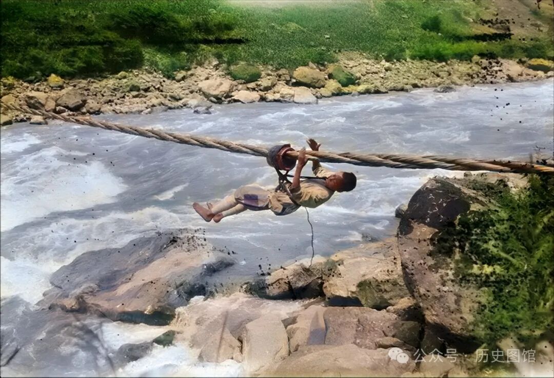 在汶川境内的一条水流湍急的河上,一名男子将自己挂在绳索上,不断变换双手,使劲往前攀援,最终到达河岸上。在过去的汶川,像这样的绳索桥有很多。如今,很多大河之上,都建造起了现代化的桥梁。