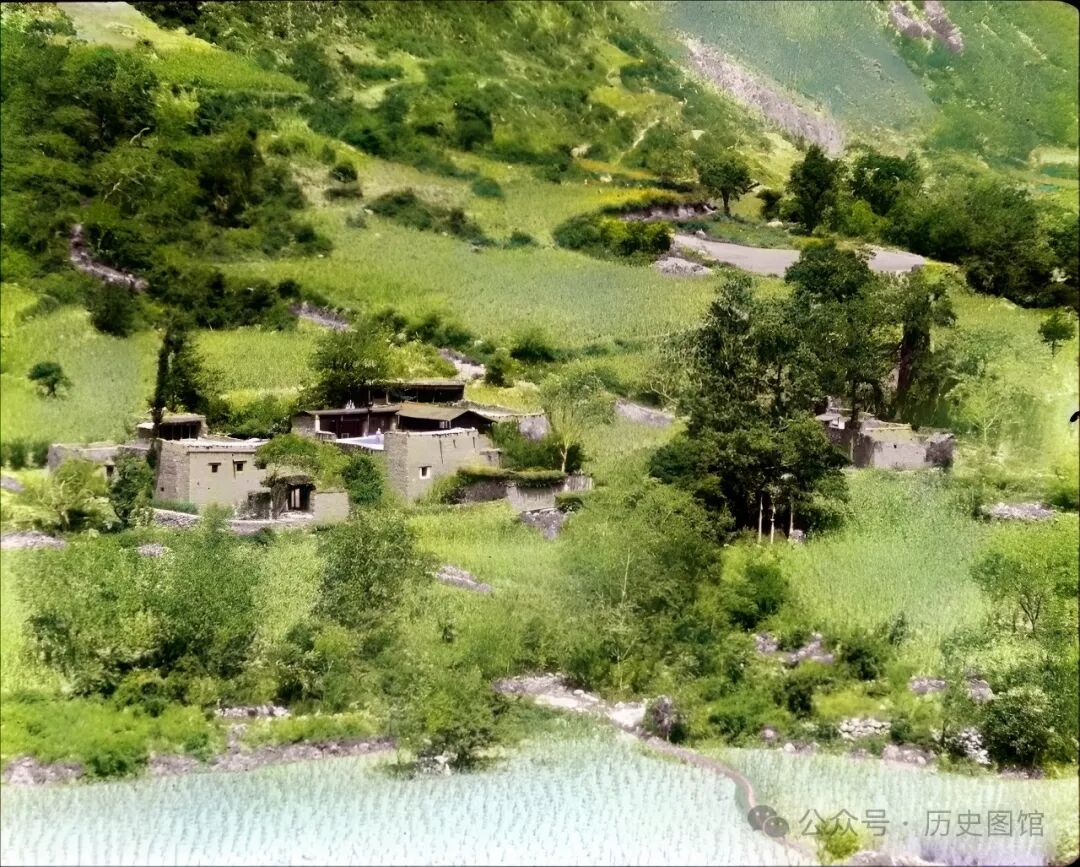 1917年,汶川一处羌族村寨景象。村寨建在山坡平坦地带,有三四户人家。房子外面,是村民们开垦的荒地,地里的庄稼章德绿油油的。