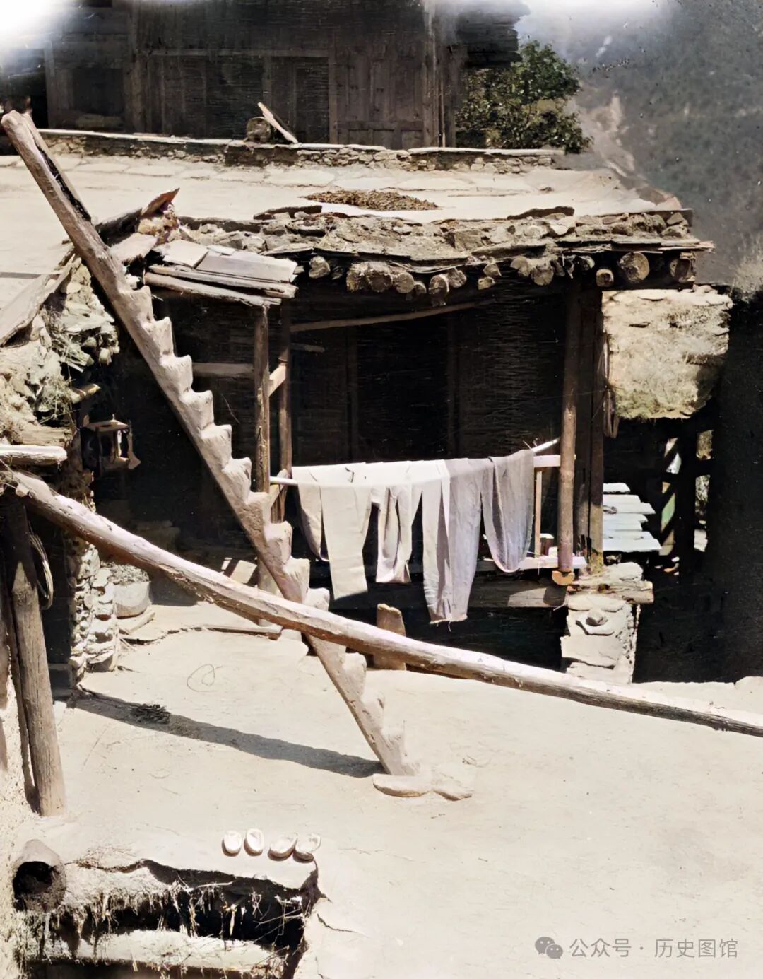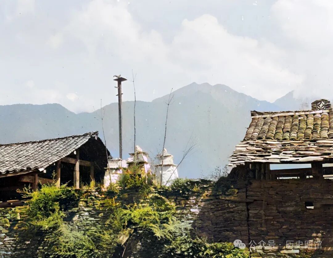 1917年,四川汶川苏村一个村寨里。一户人家的二楼平台上,搭着一只木梯。踩着梯子能上到三楼。这种房子在当地村寨很常见,大多为土木结构。屋顶的泥土有些剥落,露出了里面的木头椽子,看上有些年头了。