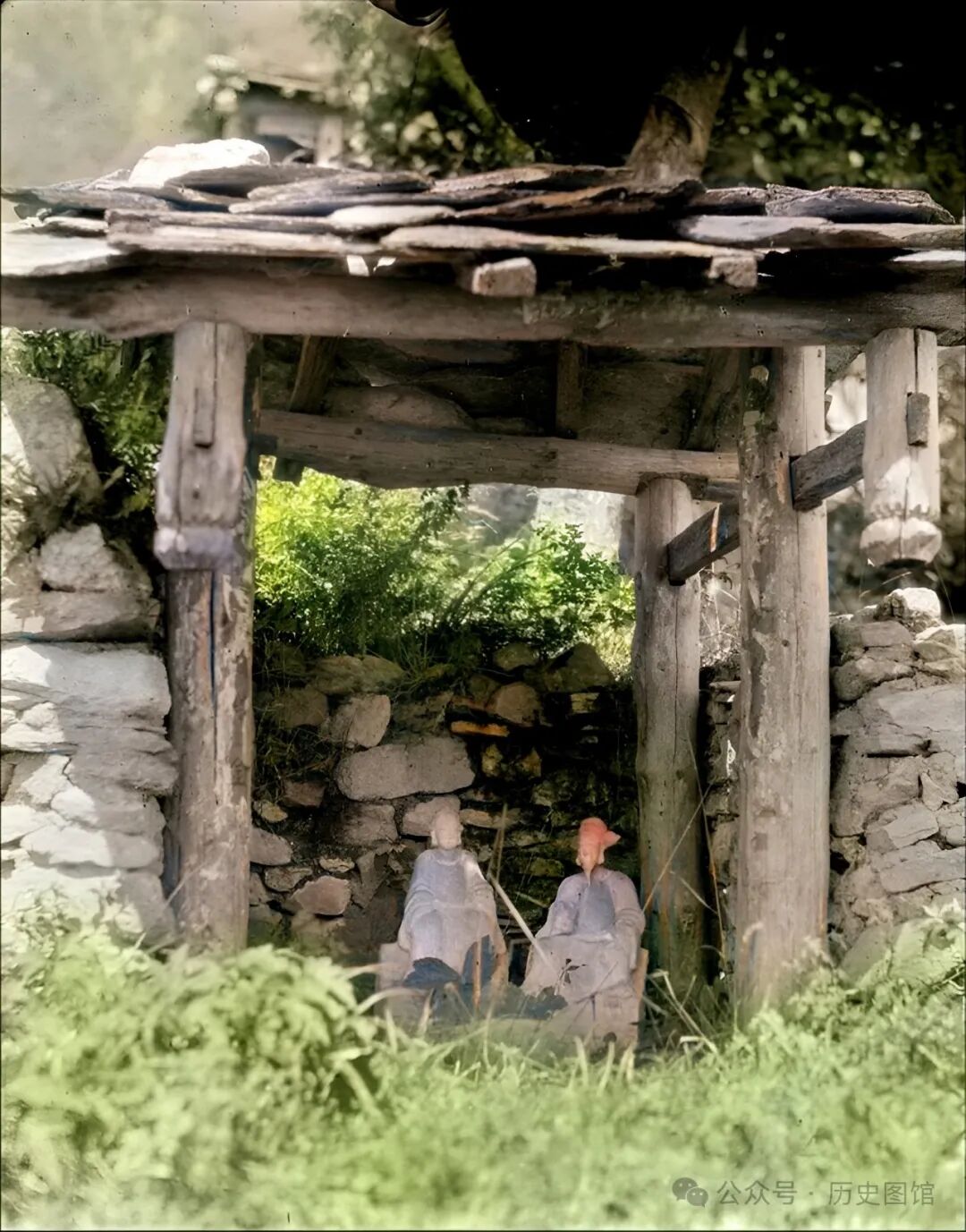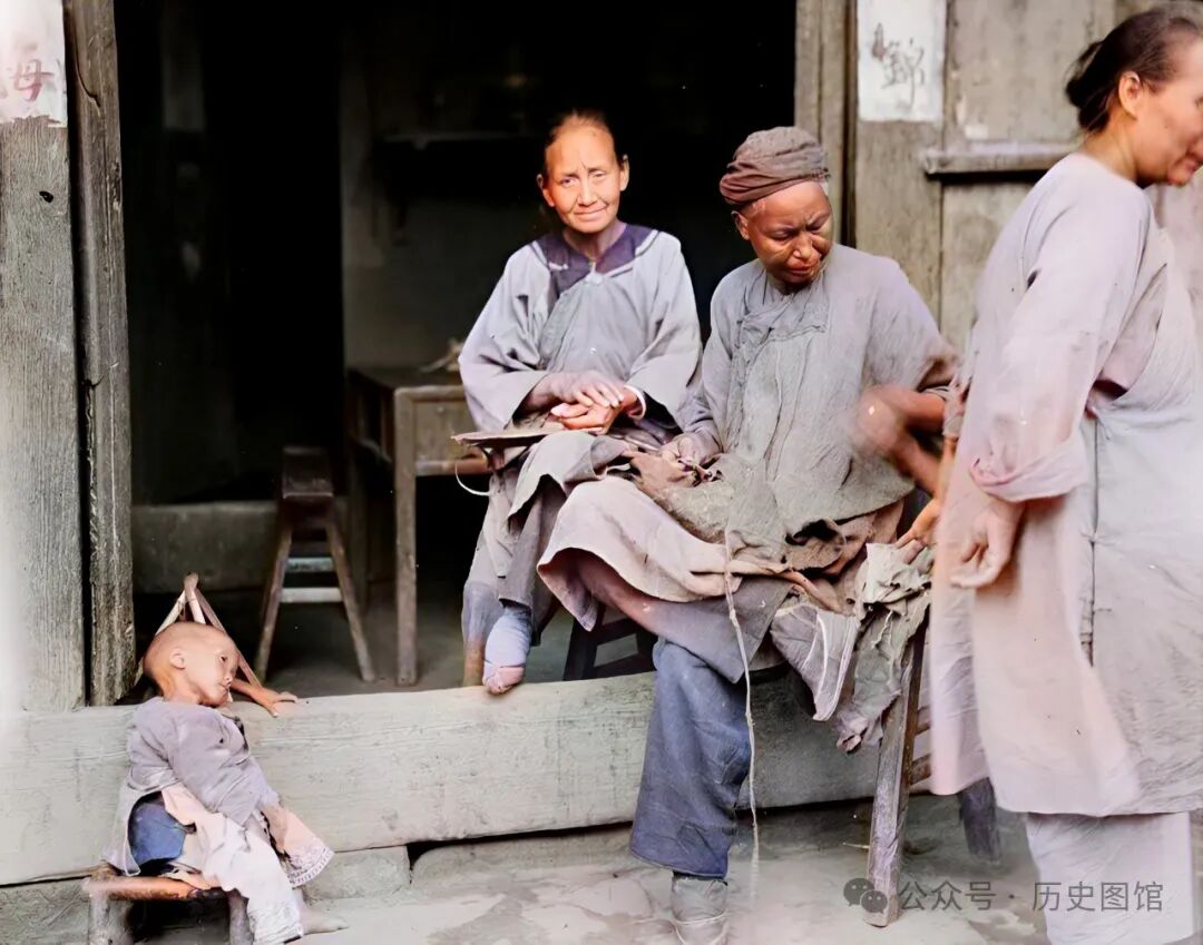 汶川当地一座村寨里,几名女子坐在门口,一边带孩子,一边忙着手里的针线活。仔细看,她们都裹着小脚。一个孩子靠在门槛上,看上去十分瘦小。这样的画面看上去很有生活气息。看到有人对着她们拍照,坐在门里的女子好奇地看着镜头。