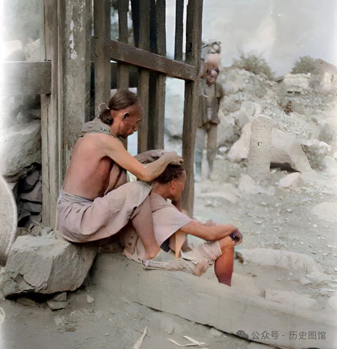 摄影师在汶川境内采风,在一座寺庙门口,他看到一名男子正在认真地给一名年轻人捉头上的虱子。在过去,人们留的都是长头发,加上不经常洗头,脑袋上生虱子是常有的事。在农闲季节,很多人都是相互捉虱子。门外面,一名背夫扛着竹篓正在赶路。