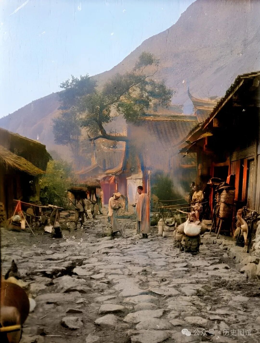 这个村落位于山脚下平坦地带,房屋建筑古色古香。不少商旅在这里停留休息,路边堆放着很多货物。照片拍摄于1917年。