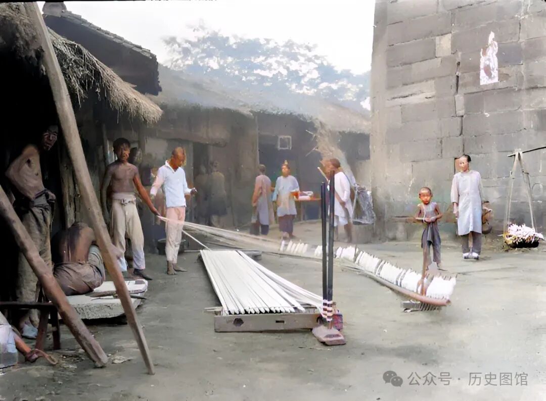 1917年,汶川境内一座村寨里,有一个小作坊,几名工人正在制作纱线。他们使用的是传统的制作工具。摄影师感到很新奇,拍下了这张照片。几名当地女子,看到寨子里来了外国人,也赶来凑热闹。照片右边,用石头垒砌的建筑,看上去像是一座碉楼。