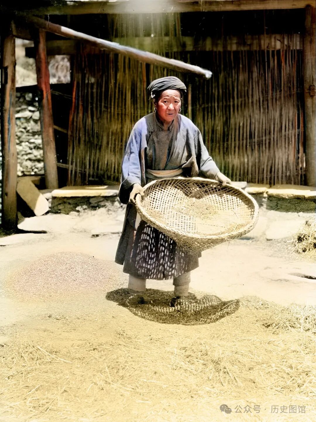 在汶川一个少数民族聚居的村寨里,一名老阿婆正在院子里晾晒谷粒,并用一个圆形的筛子,稻壳遗迹谷粒里的杂质清除出去。老阿婆如此大的年纪,仍在不辞辛劳地干活,真是让人佩服啊。