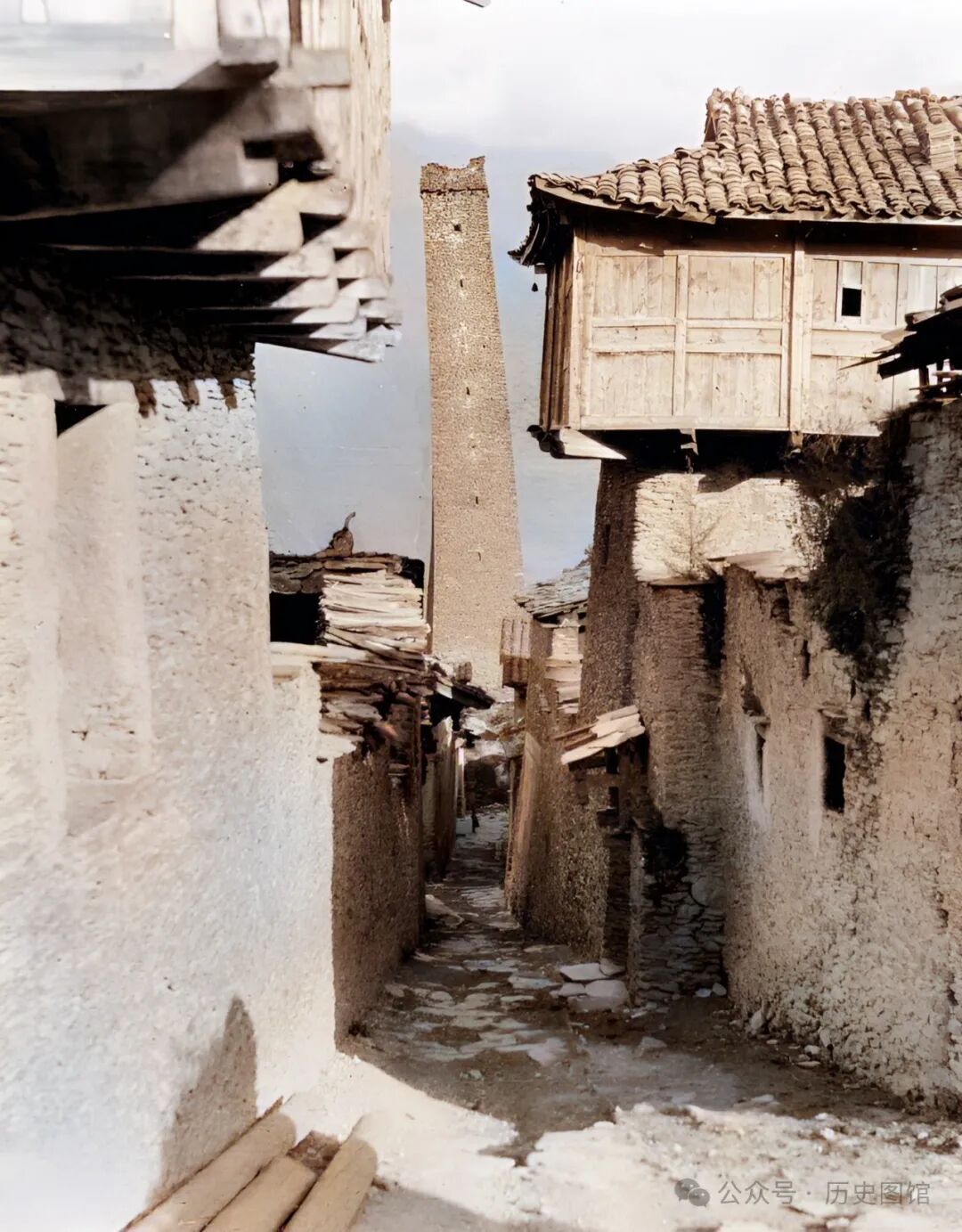 100多年前,汶川一个瓦寺土司内的景象。在小巷的尽头,矗立着一座高耸入云的碉楼,高度有39米。碉楼四壁设有瞭望窗和射击孔。