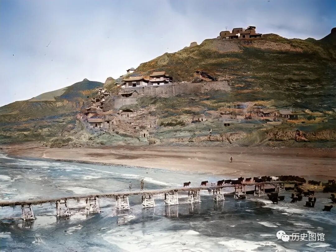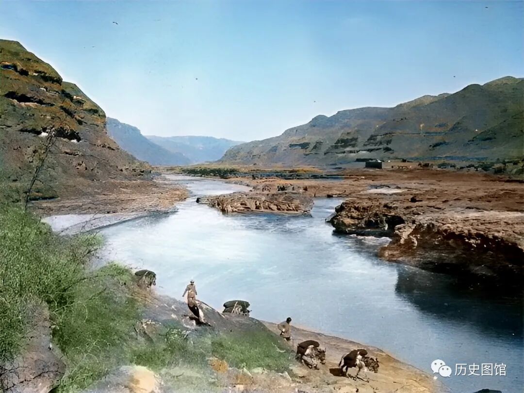 照片中,在渡口边上,一队马帮正在经过,马背上驮着货物。可见这里是当时一条重要的道路。