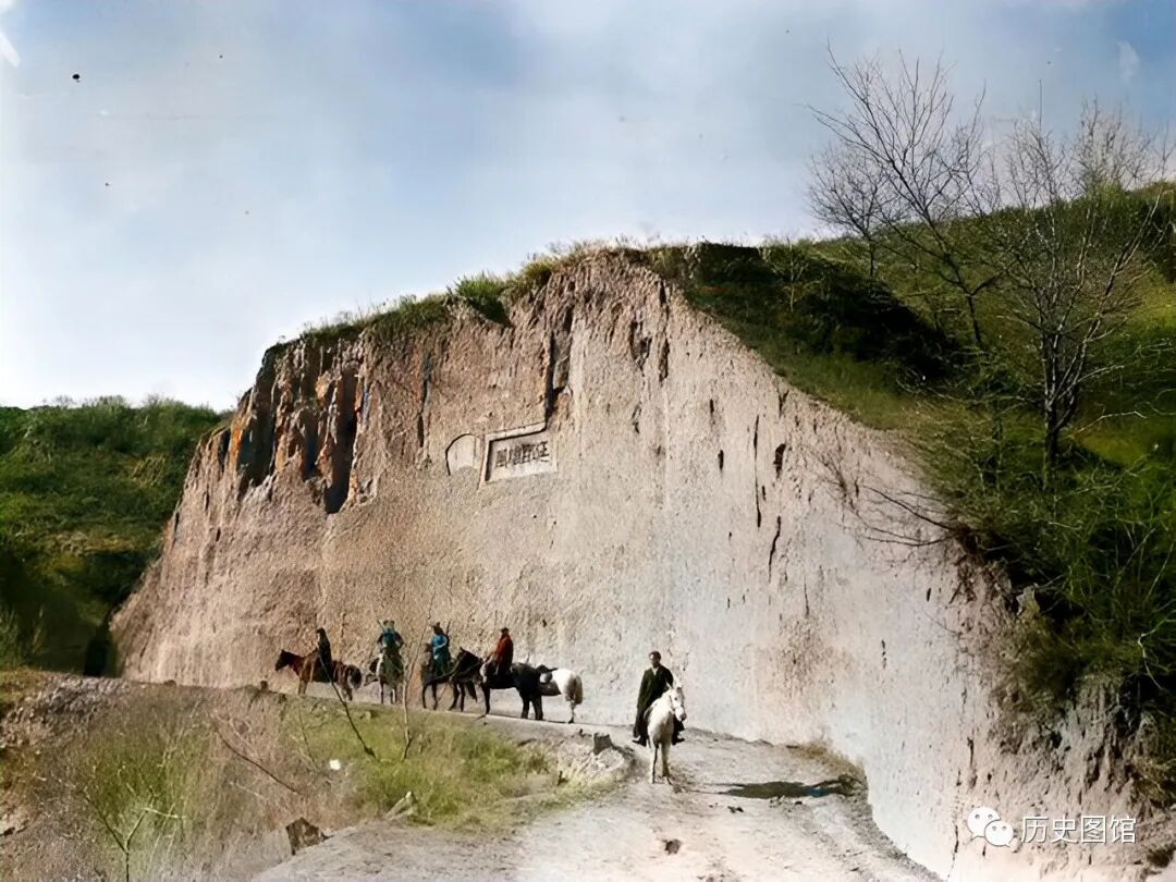 照片中,一座小山被劈开成为一条路,不得不赞叹当时人们的聪明才智。这条路也是进出甘泉县的必经之路,崖壁上还雕刻着几个大字。