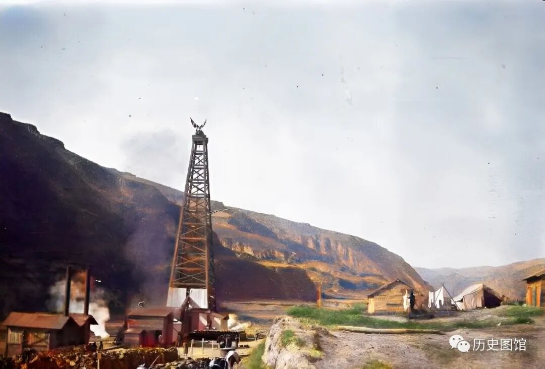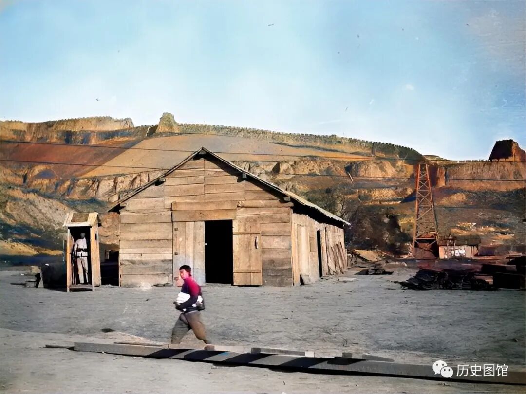 这是1914年的延安延长油田。清朝光绪31年(1905年),延安延长发现天然油矿,震惊了所有人。照片中,厂区门口有警卫把守,一名工人从门前走过。