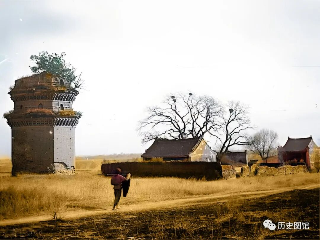 寺庙外还有一座古塔,却只剩下最下面的两层,断层处长满了灌木和杂草。一名赶路的人,扛着棍子从塔前走过。这张照片,拍摄于延安的桥山镇。