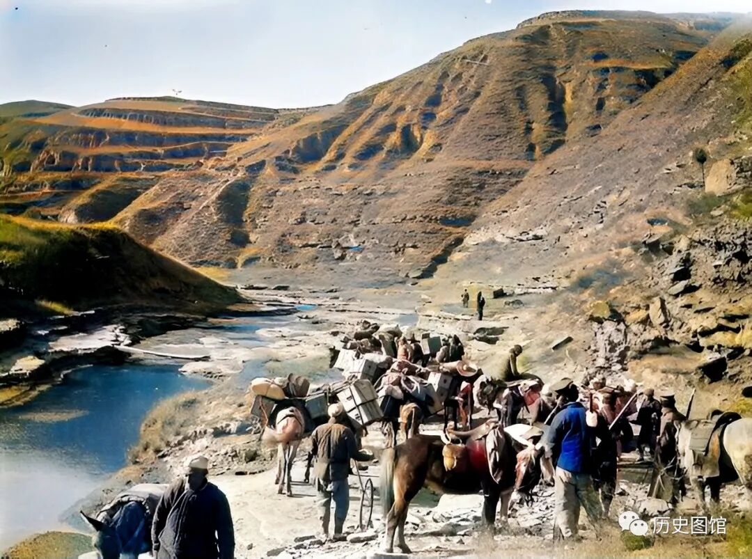 克拉普一行人在考察过程中,在路过一处河谷时,看到了一群运输茶叶的马帮,他们正在沿着河谷的道路前行。