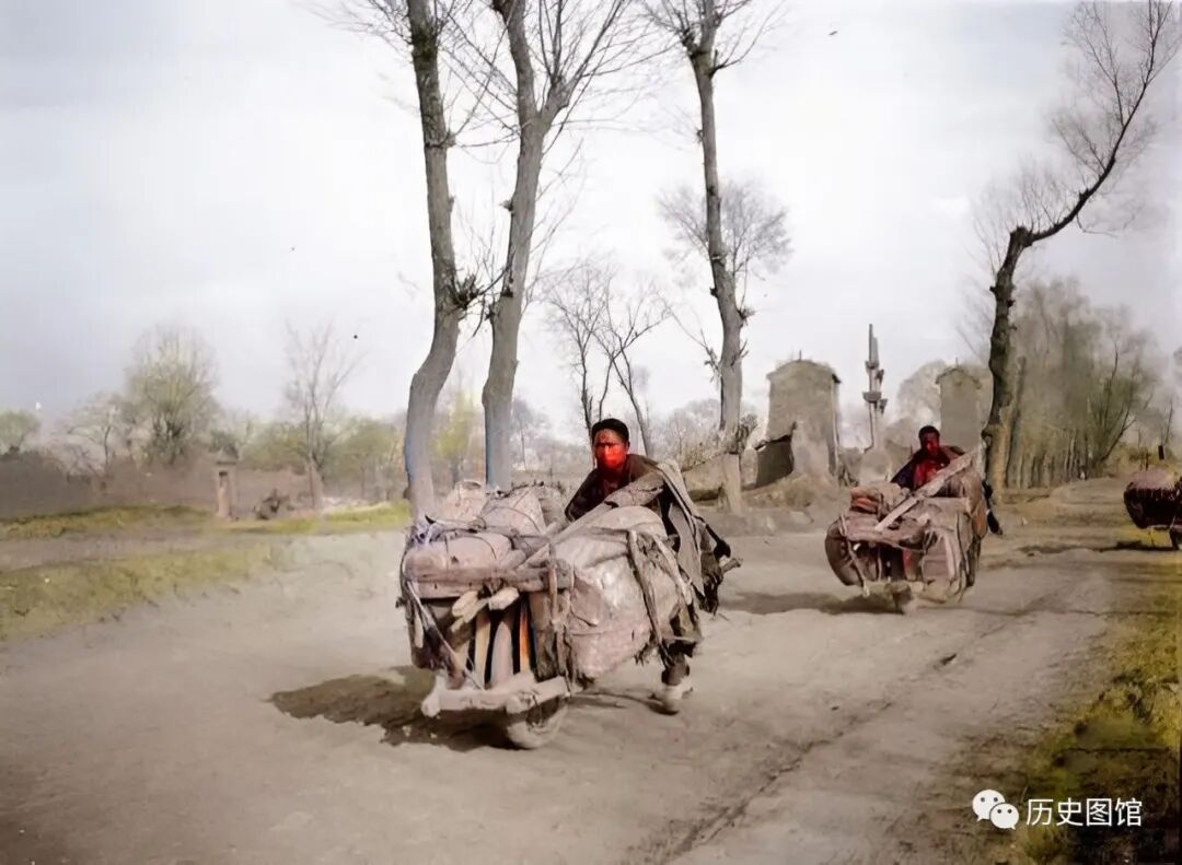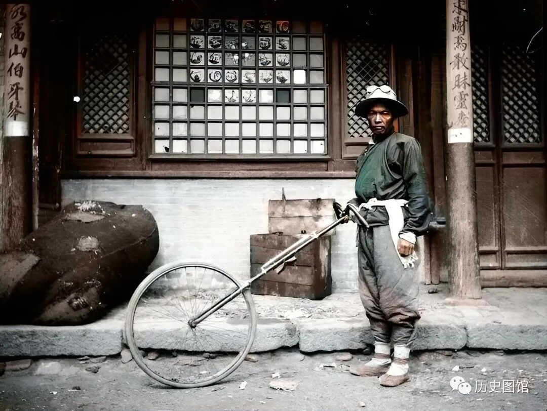 在一间客栈门前,一名修路工人正在工作。他手里推的是用来测量距离的独轮车。车轮是用自行车轮子做的,不得不赞叹劳动人民的聪明智慧。