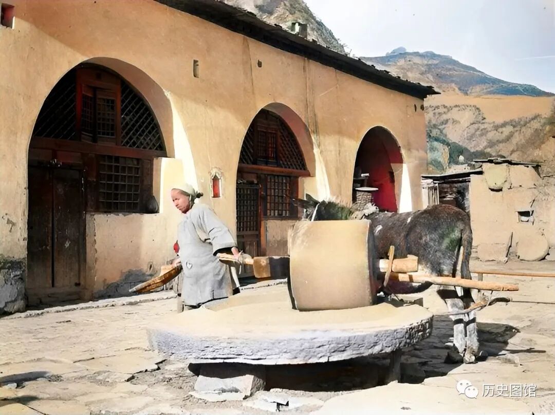 在一座农家院前,一位妇女正在碾米,头上扎着白头巾,手里拿着筛子。一头毛驴拉着石碾,围着磨盘转圈,这是当时比较传统的碾米方式。