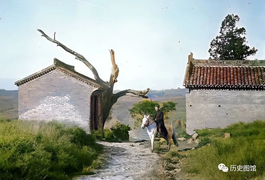 这张照片拍摄于渭南地区,路旁有一些村子,一派衰败,房倒屋塌。当时,陕西由袁世凯的亲信陆建章统治。