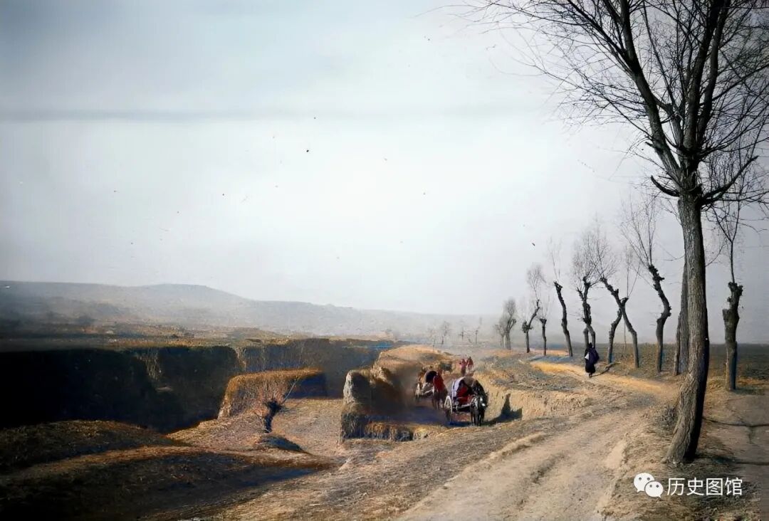 1914年,延安郊外。一条往返临潼和渭南的道路。道路崎岖不平,路边种植着一些歪歪扭扭的树木,路的另一边是深沟。