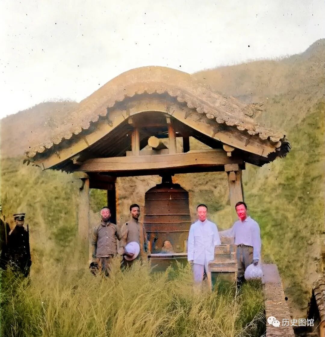 这是凤凰山上的一座禅宗寺院小西天,考察队几名中方成员和护送的警察站在寺前的大钟旁合影,其中主角为吴烓灵。