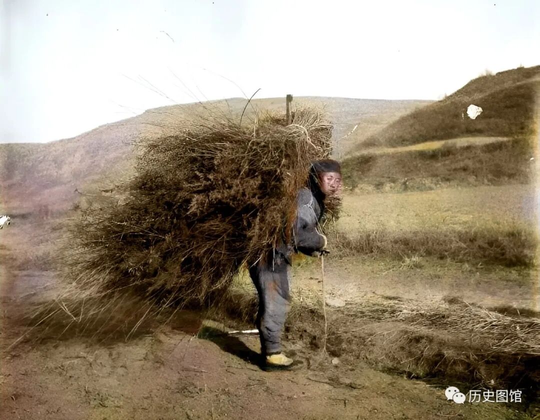秋季,一名男子来到山上,捡了很多干柴草,打成捆背在身上带回家。既可以烧火做饭,也可以冬季生火取暖。