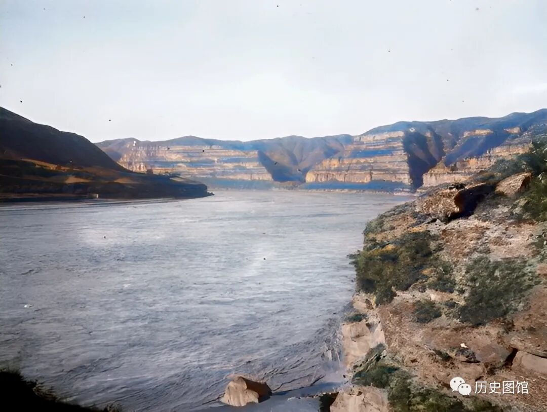 这是延安的一个古渡口,名叫圪针滩渡口,位于黄河壶口瀑布的下游。黄河水在这里形成了一个弯,水流变得平缓、狭窄,形成了一个优良的渡口。